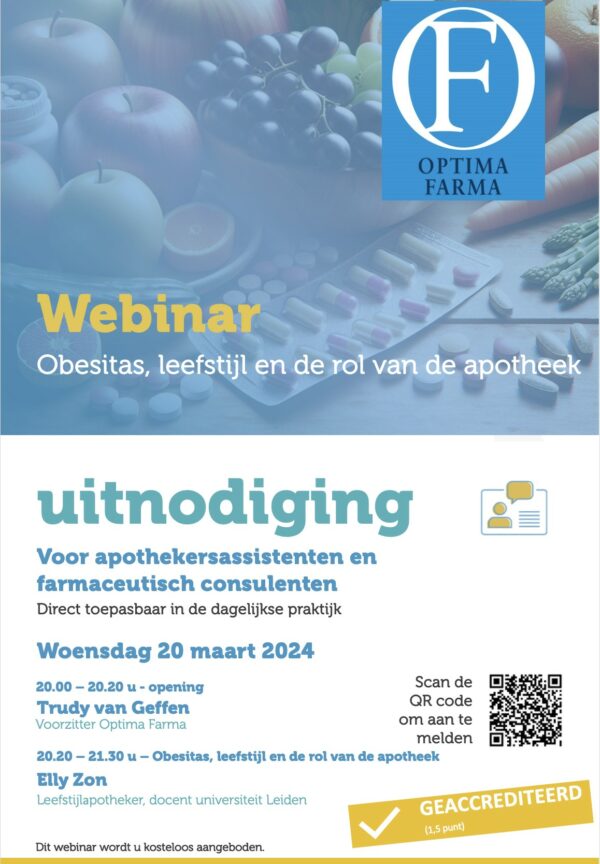 De sessie “Obesitas & leefstijl, de rol van de apotheek” is verzorgd door Elly Zon, openbaar en leefstijl apotheker en docent master opleiding farmacie LUMC. Altijd op zoek naar wegen om leefstijl advies en kennis in te kunnen zetten in de apotheek. De websinar is goed ontvangen en Optima Farma heeft vele positieve reacties gehad.